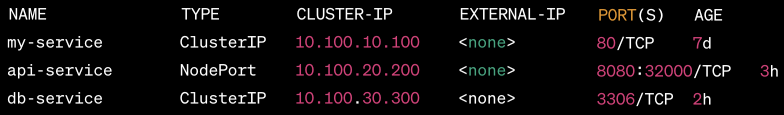 - EXTERNAL-IP: 서비스가 외부로 노출될 때의 외부 IP 주소나 로드 밸런서의 IP 주소가 표시됩니다. 없는 경우 <none>으로 표시됩니다.