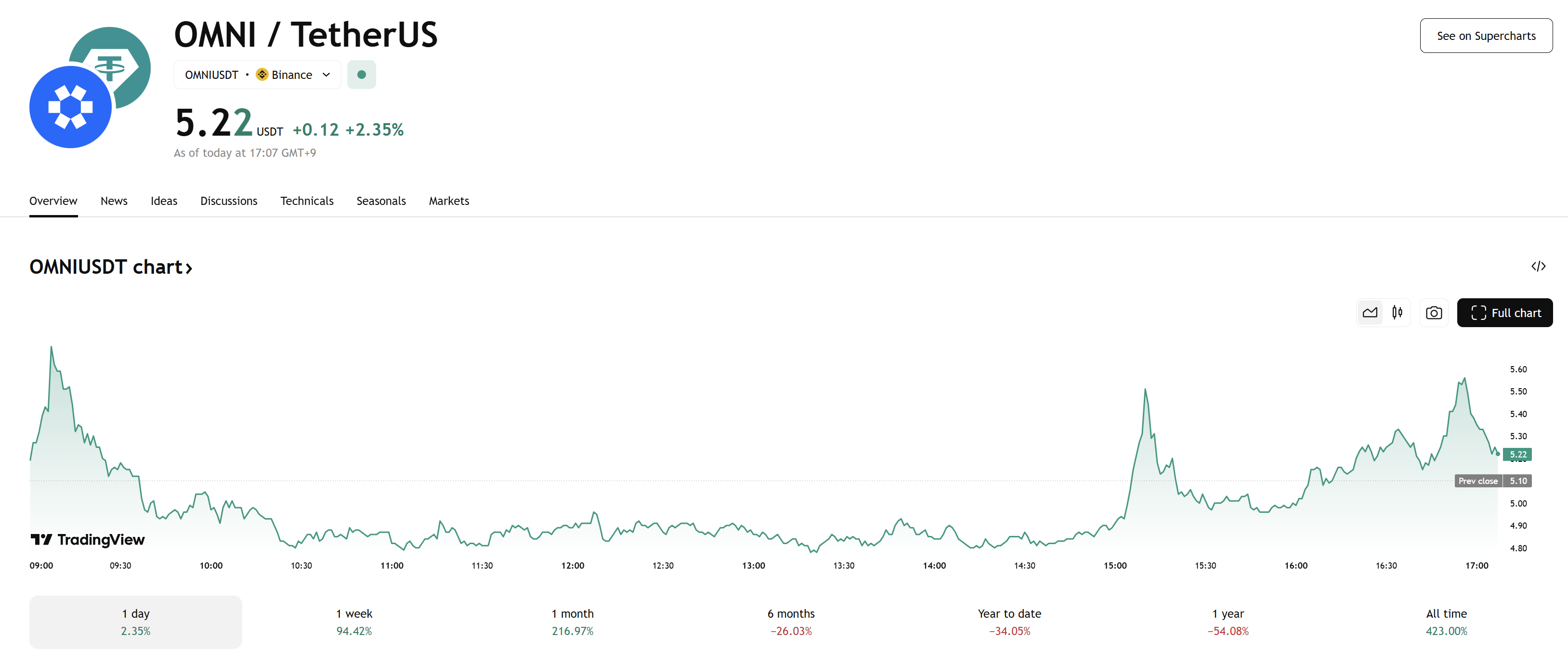 Over the last 24 hours, OMNI/USDT climbed from a low of $2.62 to a high of $7.08—an approximate 100% surge—and is now trading at $5.31.