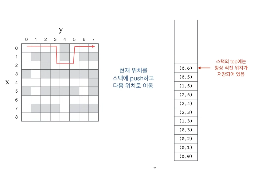 4) 갈 수 있다면 현재 위치를 스택에 push 후 그 방향으로 이동